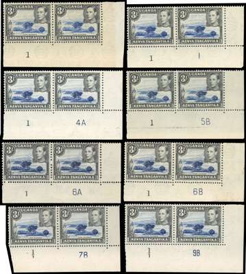 1938-50 3/- Plate pairs, o.g. Frame Plate 1 under R10/9 (only); 1-1, 1-4A, 1-5B, 1-6A, 1-6B (wrinkle, hinged on selvedge), 1-7B (hinged on selvedge, short perfs on R10/9) and 1-9B. Nice group, all perf 13 x 11¾ save 1-9B, with the first pair very scarce. SG 147-ac, £1220