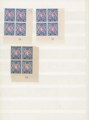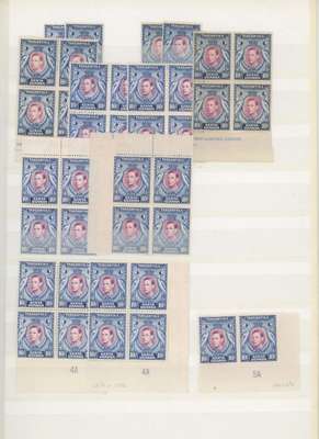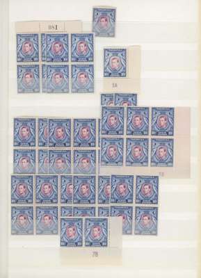 1938-54 10/- mint collection on stocksheets. Perf 13¼ hinged single from the first printing; the second printing with clear gum and in altered shade (which is quite rare) unmounted sheet number block, plain block with two hinged, and vignette Plate 3A unmounted single. Perf 14 from both printings four blocks of four, two blocks of six (one a Vignette Plate 3B block from the original printing) and a Vignette Plate 7B pair from the 1949 reprint; and two further blocks with apparent varieties on R1/9 and 9/3. All the perf 14s are unmounted. Perf 13¼ x 13¾ group of blocks (11) including Vignette Plate 4A blocks (2), 5B (2), 5A pair, also 7A block toned in an unusual shade; mostly unmounted with good shades. Fine lot. SG 149, a, b