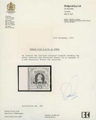 1939 1r grey and red-brown left marginal example, showing overprint triple, one inverted. Hinged on the selvedge, the stamp unmounted, light bends. B&K Certificate (1983). A very rare stamp. SG 47b, £4000