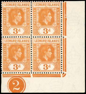 1942 3d orange lower right corner block of four with Plate 2, R10/5 serrated edge. Fine o.g., hinged on the selvedge and R9/6 only. SG 107ab, £350
