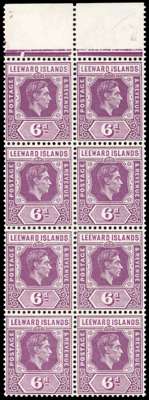 1947 (Sept.) 6d chalky paper top marginal block of eight, R4/1 broken ‘E’ and 3/1 break in base of value tablet. Large part o.g. with the variety stamp unmounted. SG 109ba, £750