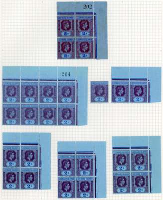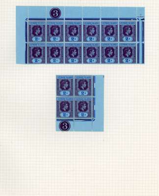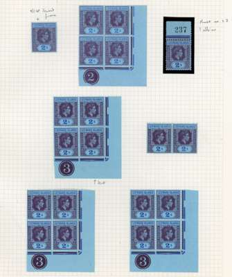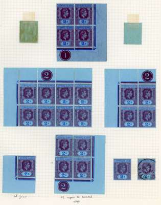 1938-51 study on five pages, nearly all mint. Includes 1938 Plate 1 LR Plate block; 1942 no Plate block, but mint block of 8; 1943 Plate 2 TL blocks of eight and four, LR block of four; 1944 Plate 2 LR Plate block of four, and single with sheet number double, one albino; 1947 Plate 3 LR Plate blocks of four (3); 1949 Plate 3 TP corner Plate block of twelve, and 1951 Plate block of four. Also a page showing a study of the R1/5 RP damaged ‘SL’ flaw, the only significant duty plate variety on this value including five mint corner blocks, one of eight. Ex Stuart Stokes, and with his explanatory guide to the pages. SG 111-ab