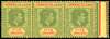 1943-4 5/- green and red on yellow ordinary paper strip of three with interpanneau margin at right, R3/5 repair to damaged value tablet, large part o.g. Ex Stuart Stokes. SG 112bb, £1200
