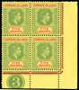 1951 5/- bright green and red on yellow paper lower right corner block of four with Plate no. 3, fine unmounted o.g. An exceedingly rare Plate block, with a handful known. SG 112c
