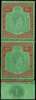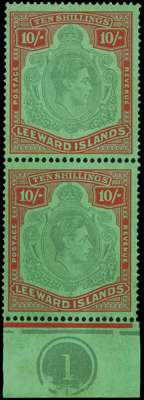 1942 (Mar.) 10/- pale green and dull red on green paper vertical pair, the lower stamp bottom marginal with Plate plug. O.g., hinged on the upper stamp only, the lower stamp with HPF #59 broken top right scroll. Extremely rare. SG 113a, ad, £8850
