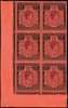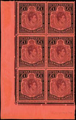 1944 (June) £1 brown-purple and black on salmon paper lower left corner block of six, hinged on the selvedge with the stamps unmounted o.g., HPFs #49a sliced scroll and 49b missing pearl, fresh and fine. SG 114b, ba, £1925