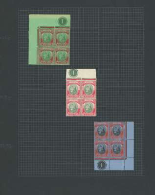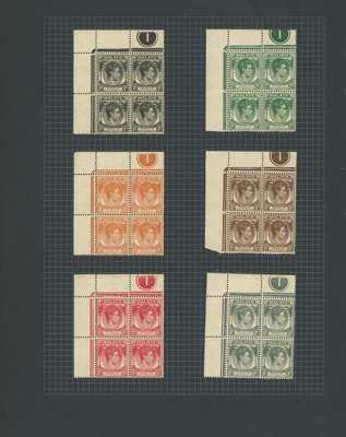 1937-41 set of eighteen in Plate blocks of four, o.g., hinged on the selvedge only. The $2 lacks the side selvedge; the unissued 8c in a marginal block with Plate 1. Some colours a little dull, still a good set and difficult in this format. SG 278-298, £1600