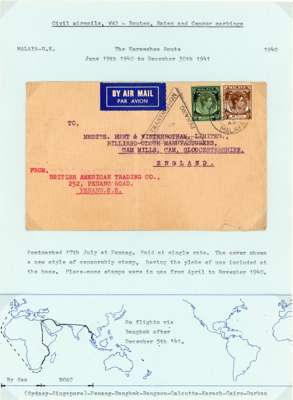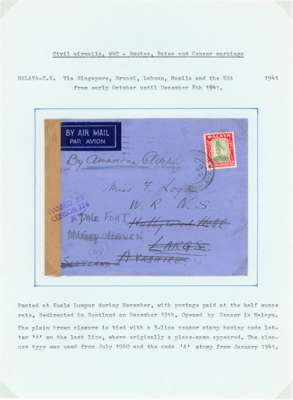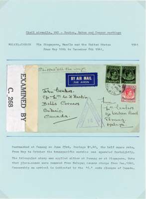 Postal History. 1940-1 envelopes; Johore $2 striated paper on cover to Hampshire, Field Post Office/ S.P. 501 CDS of 23 NO, RAF Censor 131, endorsed ‘Pan-American Clipper Throughout’, slight faults but a rare ‘Two Oceans’ cover; two envelopes to Canada and UK with Straits frankings, Penang Censors (55c and $1.40 rates), and Nov. 41 envelope with Selangor $2 (SG 87) with KL cancel, ‘By American Clipper’ endorsement, Passed by Censor 276. Fine group, ex Ian Warn