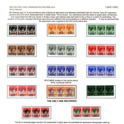 Malaya BMA SG 1bs/18s Specimens with $5 variety 'SPECIMEN' omitted