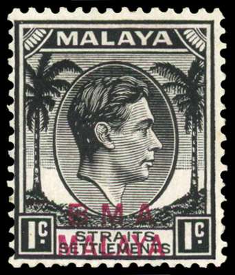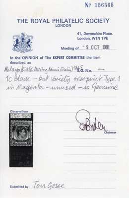 1945 1c black on chalk-surfaced paper with overprint in magenta, fine large part o.g. RPS Certificate (1991). The only genuine mint example of this stamp known to us. SG 1ab, £7000