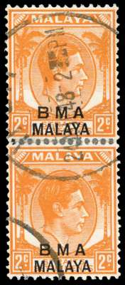 1945-8 2c orange vertical rejoined pair with watermark inverted, cancelled by Ipoh CDS of 24 AUG 48. Rare, with three pairs known, two of which are rejoined, with the other slightly defective. SG 2w, £4000