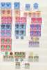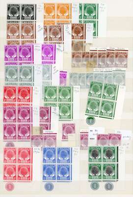 1950-5 printings collection on stocksheet, with the dates either pencilled on the selvedge or on hinges, but the comfortable majority being unmounted o.g. Includes 1953 8c deep green Plate block (one hinged), $2 Plate block and two $5 Plate pairs, plus an unmounted single and three hinged. 29 blocks, 2 pairs and 32 singles; difficult to assemble. SG 76-90