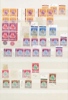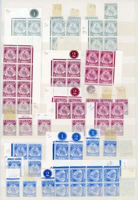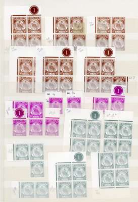 1949-55 set identified printings, mint, certain values only, mostly unmounted but some with dates written on hinges. Either contemporary datings or by comparison with a reliable collection (some of the ‘blocks’ are 3 stamps only). 4c (5 blocks, 1 single); 5c (1, 6); 6c (8, 4 and a pair), at least a dozen the pale shade; 10c (5, 6 and a pair); 20c blue (3, 6 and a pair); 25c (3, 4); 30c (1,1); 50c (0, 3); $1 (0, 9 and a pair); $2 (0, 4) and $5 (0, 5). SG 45/62