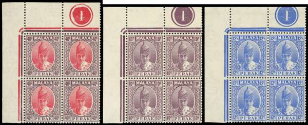 Malaya Perak SG 112-3, 117 Plate blocks mint