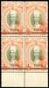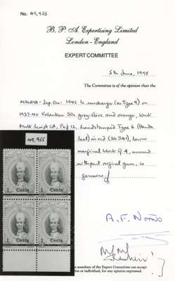 1942 Handa Seal on Kelantan 1c on 50c grey-olive and orange lower marginal block of four, o.g., hinged on the upper pair only. BPA Certificate (1998). SG J41, £800