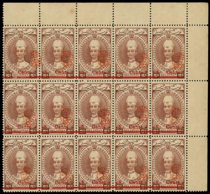 1942 8c on Kelantan 5c with Handa Seal corner block of fifteen, unmounted o.g., toned. SG J43, £1425