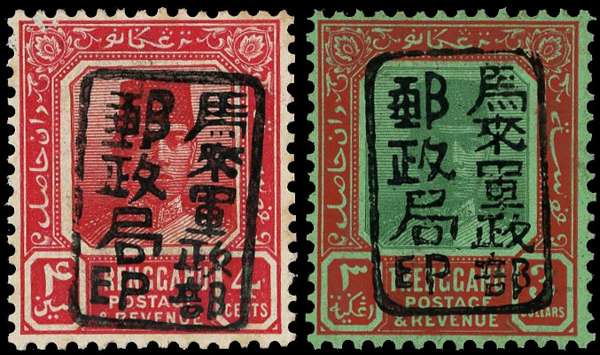 1942 Trengganu 4c with Chop A in black, and $3 green and red on green paper with Chop H in black, signed Rowell. Each unmounted o.g. SG J101, 114, £340
