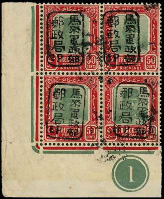 1942 Trengganu 50c green and bright carmine lower left corner Plate block of four, Chop E, unmounted o.g. Some stray ink on the front. BPA Certificate (1998). SG J112, £480