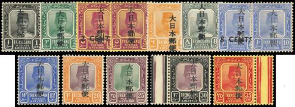 1943 Trengganu 1c-35c set of thirteen with Kanji overprints, mint, 8c with faint toning on reverse (still acceptable), several signed Rowell. SG J133-145, £450