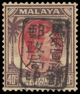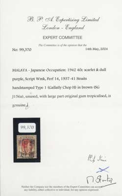 1942 Straits 40c scarlet and dull purple, chop H in brown, large part o.g., toned gum still fine and very scarce. BPA cert (2024). SG J156a, cat £1300