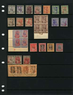 1942 Negri Sembilan mint group with varying degrees of gum toning. Handstamps in black; 1c, 5c, 25c and 30c. Violet; 1c, 3c and 15c. Brown; 1c, 2c and 5c, the latter a marginal block of four. Red; 1c pair and two singles, 3c, 5c (2), 15c corner block of four, 25c and $1. Also 2c (3) used on piece with Perak 2c with handstamp in brown. SG J161/174
