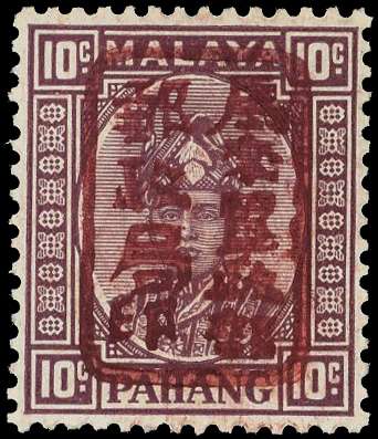 1942 Pahang 10c dull purple with Chop D in plum (= red), fine unmounted o.g., signed Rowell. SG J181a, £375