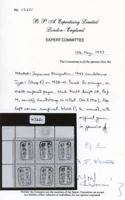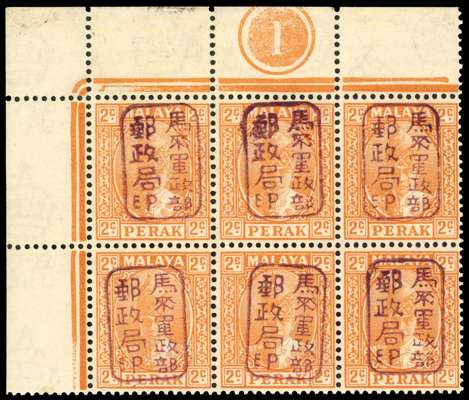 1942 Perak 2c orange with Chop E in violet top left corner block of six with Plate 1, unmounted o.g. (natural gum bubble on R1/3). BPA Certificate (1997). SG J191a, £600
