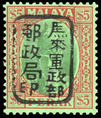 1942 Perak $5 green and red on emerald paper, large part o.g. Ex Tompkins, RPS Certificate (2001). SG J205, £750
