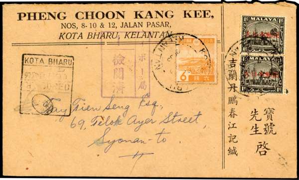 1943 business envelope to Singapore with Selangor 1c pair with horizontal overprint and Japanese 6s, Kota Bharu CDSs of 29 Dec. Despatch and arrival Censors. Rare. SG J288