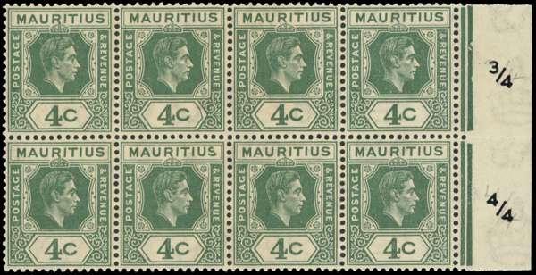 1938-43 4c dull green marginal block of eight, unmounted o.g. R3/4 RP damaged right point of value tablet and R4/4 damaged ‘S’, as SG 254cb, not listed on the early printings. Gum lightly toned, as appropriate for this printing. Ink notation of positions on the selvedge. SG 254 var