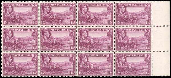 1942-8 1½d purple marginal block of twelve, unmounted o.g. Shows ‘A’ of CA in watermark omitted, between the sixth and tenth stamps. Rare. SG 103ab, £1400