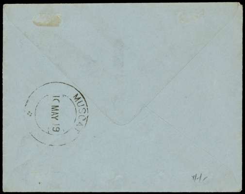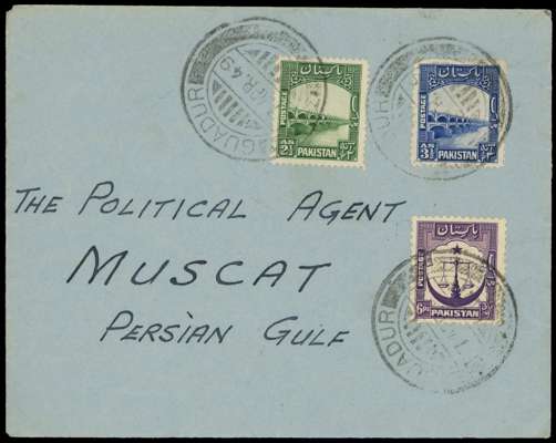 1949 envelope to Muscat with Pakistan 6p, 2½a and 3½a tied by Guadur CDSs of 7 AP. Muscat arrival of 10 MY on reverse, very fine and scarce
