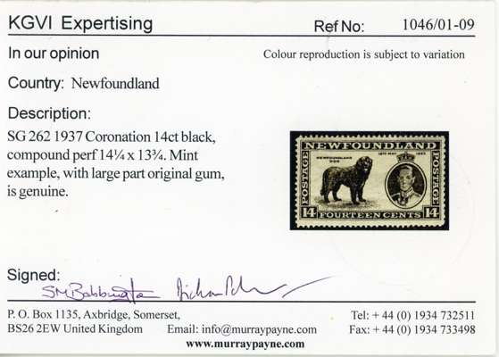 1937 Coronation 14c black, compound perf 14¼ at top and 13¾ at sides and base, large part o.g. Gum crease. A great KG VI rarity. KG VI Expertising Certificate (2009). SG 262e, £28000