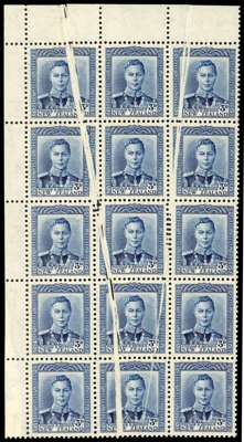 1941-52 3d blue top left corner block of fifteen, o.g., hinged on the selvedge only. Two major pre-printing paper creases, giving wider stamps, unprinted areas and doubled perforations, a spectacular multiple. SG 609 var