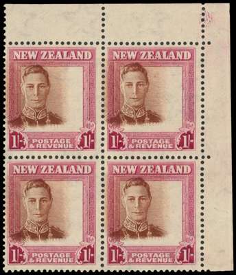 1947 1/- watermark upright, Plate 1. Upper right corner block of four with a fine vignette shift, upwards to left, unmounted o.g. Spectacular. SG 686b var