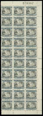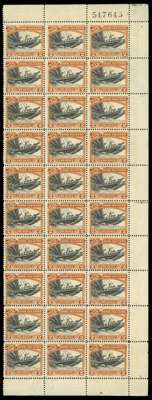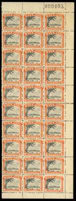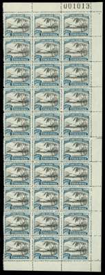 1932-44 Pictorial values to 6d, mixed watermarks blocks of thirty, unmounted o.g. 1d, 2d and 2½d Single watermark; ½d, 4d and 6d Multiple watermark. The 4d watermark is inverted and reversed, and the 6d has one stamp (R8/10) officially patched in, for reasons unknown. SG 63-5, 89, 93y, 94