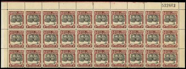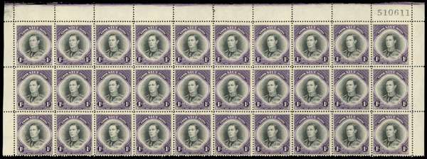 1938 1/-, 2/- and 3/- blocks of thirty, unmounted o.g. The 1/- and 2/- top three rows, with sheet numbers, 2 x 2/- affected by a foxed spot; the 3/- the three left columns, all with good gum. SG 75-7, £1800