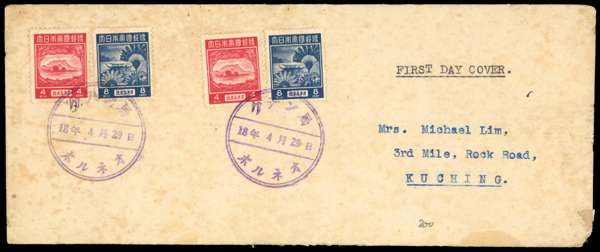 Japanese Occupation. 1943 4c and 8c pair, two of each on slightly stained plain first day cover, locally used at Kuching. Two violet CDSs Type JD1. SG J18-19