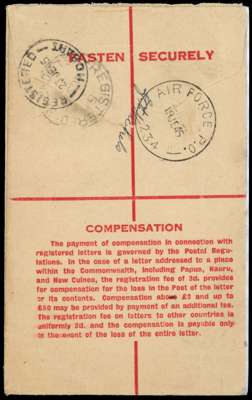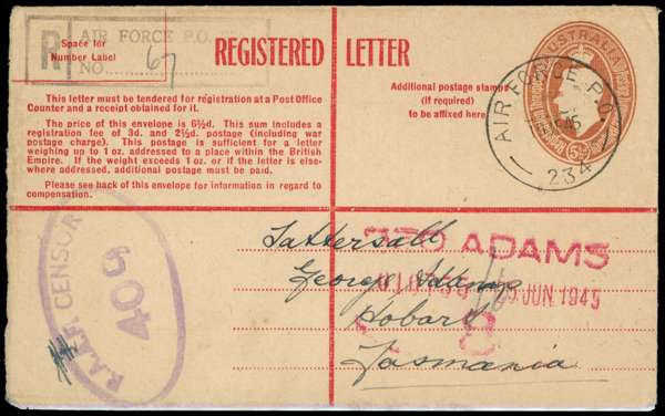 Postal Stationery. 1945 Australia Size G 5½d registered envelope, cancelled by Air Force P.O. 234 CDS of 19 JE 45. Air Force P.O. registered cachet, and oval RAAF 409 censor in violet. Scarce