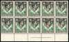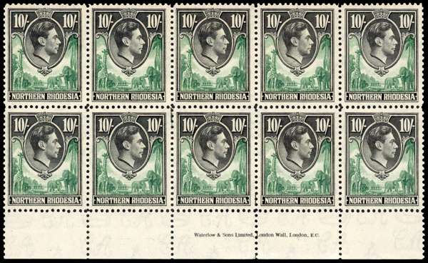 1938-52 10/- green and black imprint block of ten, fine unmounted o.g. SG 44, £380