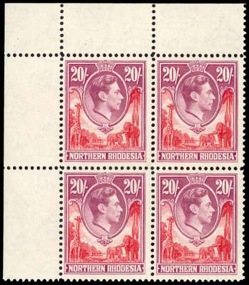 1938-52 20/- carmine-red and rose-purple top left corner block of four with early wartime gum (maybe about 1942), with R2/2 early trace of the flaw at left of the name tablet, unmounted o.g.; R1/1 with a small natural inclusion, not visible from face. SG 45 var