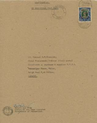 1947 5r green and blue ‘Star and Crescent’ used on registered Official cover (218 x 278mm) to an official at the Amir's Karachi residence, cancelled by Deh-Rawal CDSs of 29 AUG. Drigh Road arrivals of 1 SEP front and reverse. The backflap with three HOME MINISTER/ BAHAWALPUR wax seals. A magnificent cover, highly important and a fine showpiece. PFPakistan Certificate (2010). SG 17, unpriced used