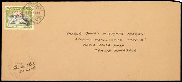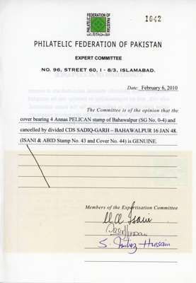 Officials. 1948 envelope with 4a black and olive-green tied to envelope by Sadiq-Garh 16 JAN 48 CDS, the stamp with a couple of short perfs. Official cachet on front and wax seal on reverse. PFPakistan Certificate (2010). SG O4