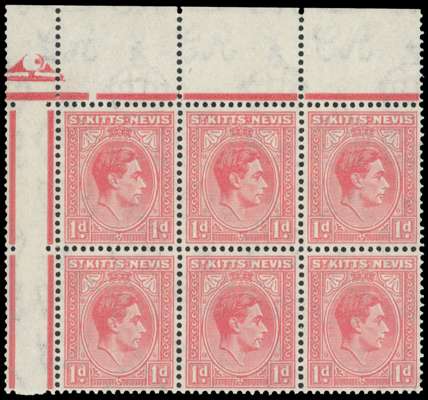 1947 1d carmine-pink top left corner block of six from right pane, o.g. Lightly hinged on the selvedge only. Scarce. SG 69b, £390