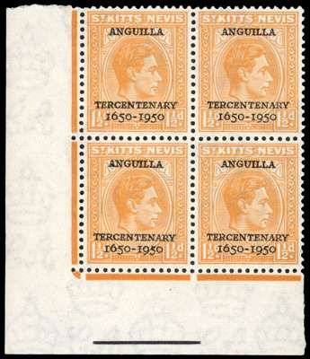 1950 1½d Tercentenary left marginal block of nine, unmounted o.g., the central stamp showing Crown omitted from watermark. Arricator on reverse (stuck to selvedge only) pointing to the omission. SG 87a, £3000