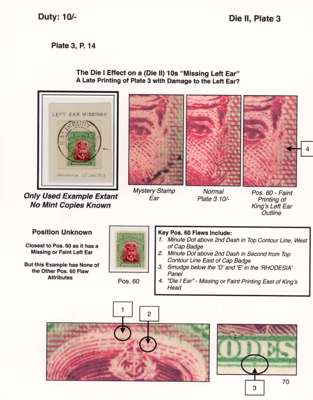 10/- Head Die II, perf 14. Large part o.g. example, the ‘mystery stamp’, position 60 from a late Plate 3 printing (confirmed by break in frame below ‘DE’ of RHODESIA). It shows a “Die I effect” on the King's right ear, which is largely missing. A controversial stamp, of which three mint and one used example have been reported. Presented on exhibition page. SG 241a