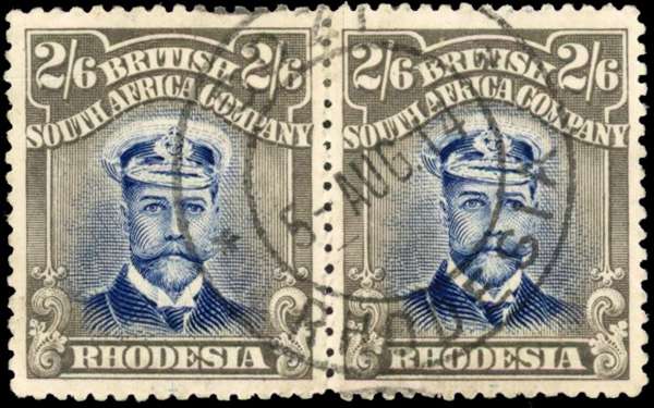 2/6d Head Die II, perf 15. Horizontal pair in deep blue and grey-brown, with almost-full Odzi DC of 5 AUG 14. An unusual multiple, with much gum so of excellent colour. SG 249, AH 2b