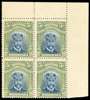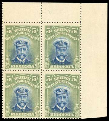 5/- Head Die II, perf 15. Upper right corner block of four, the variant shade in blue and sage-green, very fine o.g., the left pair sharing a pencil tick on the reverse (which also has pencilled “LW 28/8/19” on the selvedge). A very rare shades, believed to be unique and a multiple, ex Gibbs, Vestey and Spivack. SG 251, AH 2 Var