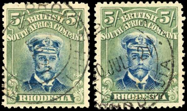 5/- Head Die IIIA. Two used shades, one with Broken Hill DC 8 JUL 21, the other with part Lusaka DC of 20 JUL 21. The latter with spot in frame colour inside right ‘5’, ex Montgomery, with an inconsequential small foxed spot on reverse. SG 255n, AH 7