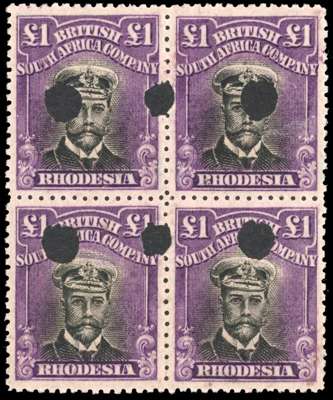 Rhodesia £1 SG 255u punched block of four from the file sheet